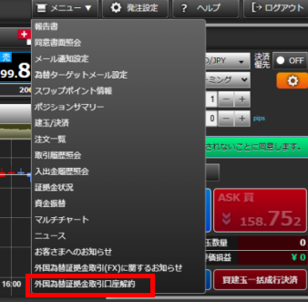 FXダイレクトログイン専用パスワードの設定をし、恐らくこれがPCのSatndard版と思われるサイトにログインしました。ログイン後、メニューに外国為替証拠金口座解約があったので、