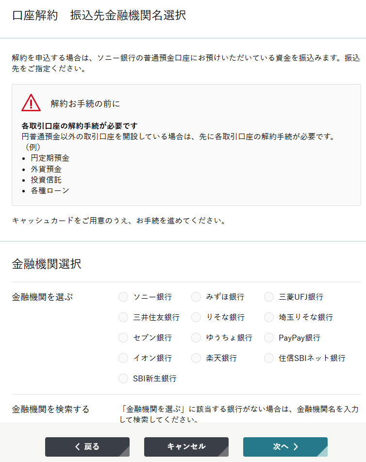 当初、上記を知らず、ソニー銀行の場合、残額が0円であれば、インターネットバンキングから解約が可能とあったので、(詳しくはこちら)口座を0円にしようとしました。